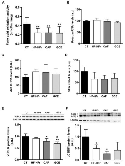 To explore other mechanisms potentially involved in the observed effects on hepatic TGs, we determined the β-oxidation activity in liver samples. The results showed a significant decrease in response to the HF-HFr diet, with CAF or GCE addition having no effect on this decrease (Figure 6A). The mRNA levels of peroxisome proliferator-activated receptor α (Pparα), and the PPARα target genes acyl-CoA oxidase (Aco) and very-low density lipoprotein receptor (Vldlr) were not modified by the diet or treatments (Figure 6B–D). However, the protein levels of VLDLR despite not being increased by the HF-HFr diet were significantly lower in the CAF and GCE groups, and GCE even lowered the amount of this protein compared to the CAF group (Figure 6E).