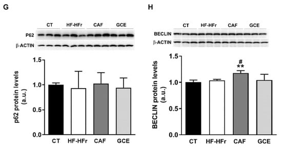 The autophagy of lipid droplets was described as another form of lipid catabolism. As shown in Figure 6F, the ratio of the microtubule-associated protein 1A/1B-light chain 3 (LC3) B-II/I was significantly reduced in the HF-HFr group, with CAF or GCE treatment not reversing this decrease. However, neither diet nor treatments reduced the levels of the autophagy substrate p62 (Figure 6G), while beclin-1 levels showed a small but significant increase in the CAF group (Figure 6H).