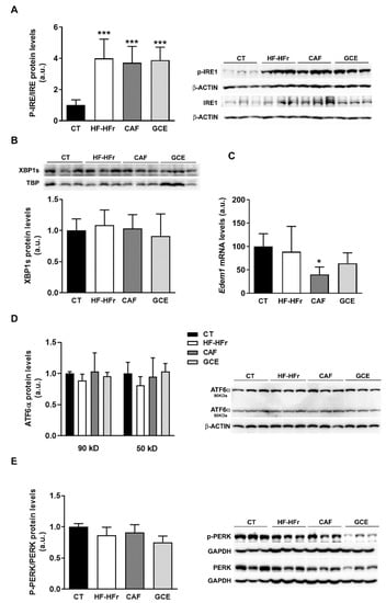 Western Blot of phosphorylated and total IRE1 (A), nuclear XBP1S (B), precursor (90 kD) and mature (50 kD) ATF6 (D), and phosphorylated and total PERK (E) in liver samples. Bar plots represent the mean ± SD band intensity of the proteins obtained from three samples per group, each one pooled from two animals. Bands are shown in the upper part of the figures. (C) mRNA levels of Edem1 in the livers from CT (n = 5), HF-HFr (n = 6), CAF (n = 6), and GCE (n = 6) experimental groups. * p <0.05; *** p < 0.001 vs. CT.