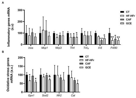 Bar plots showing the mean ± SD of specific mRNAs of pro-inflammatory molecules iNos, Mcp1, Nlrp3, Tlr4, Tnfα, Il-6, and F4/80 (A) and oxidative stress genes Gpx1, Sod2, Nrf2, and Cat (B) in the livers from CT (n = 5), HF-HFr (n = 6), CAF (n = 6), and GCE (n = 6) experimental groups. * p < 0.05; ** p < 0.01; *** p < 0.001 vs. control. & p < 0.05 vs. CAF group.