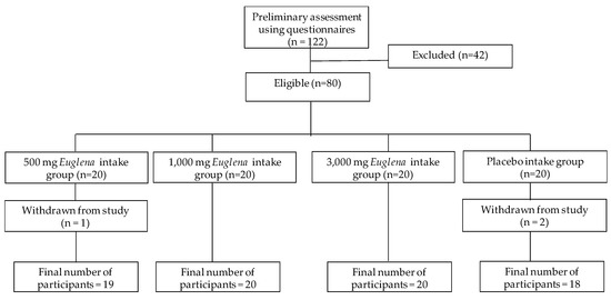 Euglena gracilis powder was obtained from euglena Co. Ltd. (Tokyo, Japan). The placebo food was the same formula but without Euglena powder.