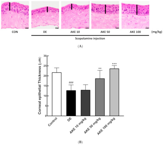 When DE symptoms develop, the corneal epithelial tissue thins to a delicate slim stratum [45]. In order to evaluate the effect of AKE on corneal epithelium from DE mice, we measured the thickness of corneal epithelial cells by histology. In Figure 2A, the dark pink area represents the corneal epithelial layer. This was significantly reduced in the DE group compared with the control (CON) group. AKE treatment inhibited the thinning of the corneal epithelial layer at doses of 50 and 100 mg/kg (Figure 2A,B).