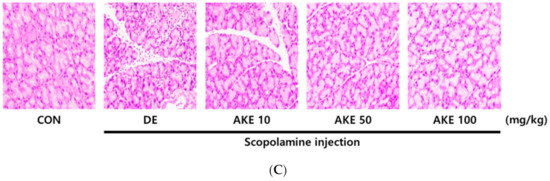 All procedures received approval from the Institutional Animal Care and Use Committee (IACUC) of Korea Institute of Science and Technology (KIST): KIST No. 2020-002, Gangneung Institute, and they were performed according to the Association for Research in Vision and Ophthalmology (ARVO) statement for the Use of Animals in Ophthalmic and Vision Research. Mice were accommodated in the animal room with air conditioning, temperatures of 22 ± 2 °C, humidity of 50 ± 10%, and 12 h light/12 h dark circadian cycles. Food and water were supplied ad libitum. Mice were acclimatized for 1 week and were later assigned into five groups composed of seven male 6-week-old BALB/c mice. Experimental DE in mice was achieved by twice-daily intraperitoneal (i.p.) injection of 200 μL (2.5 mg/mL) of phosphate buffered saline (PBS)-diluted scopolamine (Sigma-Aldrich). Groups of mice were orally administered with AKE once per day at concentrations of 0 (as vehicle control), 10, 50, or 100 mg/kg in 200 μL EtOH. In the control group, only PBS buffer was injected without scopolamine. In the case of AKE, 0 mg/kg in 200 μL EtOH was administered when orally administered as in the DE group. After 2 weeks, tear production was quantified by a standard Schirmer’s test strip placed in the lower one-third of the temporal eyelid before the eye was closed for 1 min. After the strip was removed, the length of the wet point was measured in millimeters in order to determine the Schirmer’s test value. For measurements of the tear breakup time (TBUT), 5 μL of sodium fluorescein was instilled into the eye and photographed. Corneal surface staining was performed to assess the extent of corneal surface changes. The corneal surface was observed and scored after the administration of one drop of 3% fluorescein (Sigma-Aldrich, St. Louis, MO, USA) into the inferior lateral conjunctival sac. The staining of the cornea was evaluated in a blinded manner. Mice are euthanized through cervical dislocation. When removing the cornea, click the mouse’s eyelid and use forceps to cut out the eyeball’s optic nerve that pops out and removes the cornea. After removing the crystalline lens inside the cornea, store in a freezer at −80 °C. After pulling the mouse’s lower jaw with forceps for removal of the lacrimal gland, cut off the epidermis of the pulled part so that the lower part of the mouse’s face can be seen. A lacrimal gland located near the lower jaw of the mouse can be secured. The secured lacrimal gland tissue is stored frozen at −80 °C.