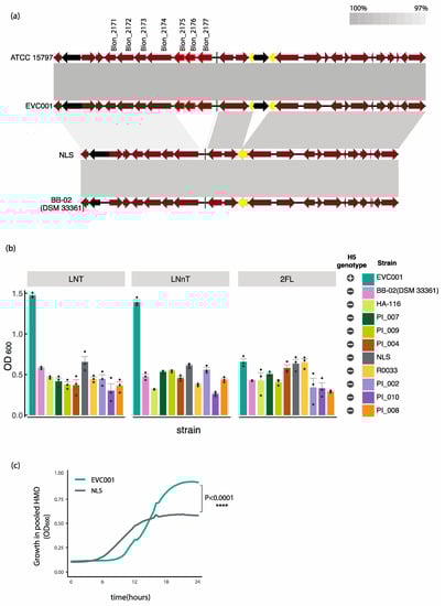 To determine growth on a broader array of HMO structures present in human milk, representative strains from Group 1 (EVC001) and Group 2 (NLS) were grown on purified HMOs isolated from pooled human breast milk. Strains were selected on the basis that they represent the two identified H5-positive and H5-negative genomic variants of the H5 cluster and were available as single-strain probiotic products, facilitating subsequent feeding trials. As shown in Figure 2c, the Group 1 strain EVC001, which is H5 positive, reached significantly higher cell densities (p < 0.0001; two-way repeated-measures ANOVA) than the H5-negative NLS strain (Figure 2c).