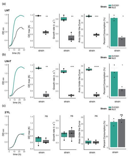 Growth on HMOs of select B. infantis strains. Growth kinetics and HMO consumption of B. infantis EVC001 (H5 positive, Group 1) and B. infantis NLS (H5 negative, Group 2) in mMRS medium containing (a) lacto-N-tetraose (LNT), (b) lacto-N-neotetraose (LNnT), or (c) 2′-fucosyllactose (2′-FL) as the carbon source. Growth indicators were compared, with statistical significance determined by Student’s t-test indicated with asterisks; ns: not significant, * p < 0.05, ** p < 0.01, *** p < 0.001 and **** p < 0.0001.