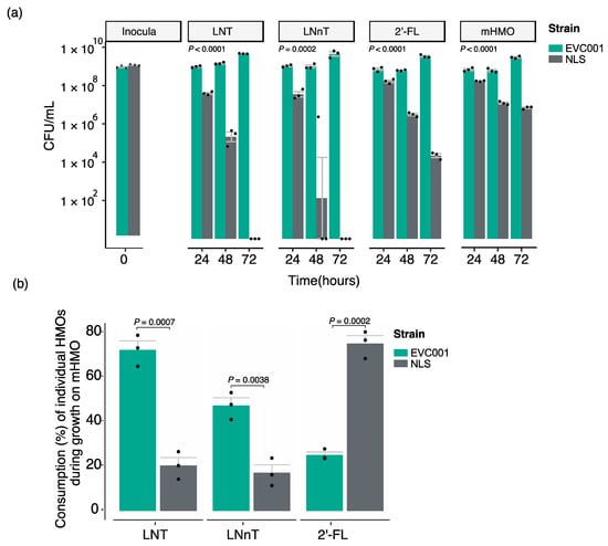 (a) In vitro competition experiments between the B. infantis strains EVC001 and NLS in the HMO standards lacto-N-tetraose (LNT), lacto-N-neotetraose (LNnT), 2′-fucosyllactose (2′-FL), or an equal combination of all three (mixed HMO (mHMO)). (b) Percent consumption of individual HMO standards by B. infantis EVC001 and B. infantis NLS during growth on mHMO. Statistical significance of strains in competition was determined by two-way repeated-measures ANOVA with Holm–Sidak multiple comparison adjustment. Significant differences in percent consumption were determined by Student’s t-test.