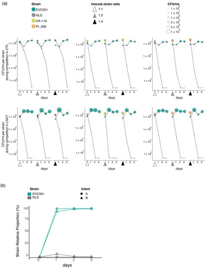 Co-inoculation competition experiments with varying strain ratios in the inoculum, were performed to determine whether the starting inoculum had an impact on the observed ecological fitness of strains, as well as to determine if the fitness disadvantage observed for NLS was true for other H5-negative strains. For this experiment, we choose LNnT and 2′-FL, as these were the HMOs for which the growth differences between EVC001 and NLS had been most prominent and most comparable, respectively. Mixtures were prepared at 1:1, 1:2, and 1:4 ratios, favoring the H5-negative strain. Results from this experiment show that the initial inoculum did not alter the observed competitive fitness of strains. Specifically, the H5-positive EVC001 outcompeted all three H5-negative strains (NLS, HA-116 and PI_008) by the third day of competition despite being at a numerical disadvantage in the inocula. These competitive dynamics do not appear to be strain or HMO-specific. As shown in Figure 5a, all H5-negative strains were detected 24 h after the initial inoculation but were eventually outcompeted by the second or third day of competition. The only exception to this trend was for the strain HA-116, which became undetected after 24 h in competition when inoculated 1:2 with EVC001. Furthermore, following the trend observed in the previous competition experiments using larger volumes, the strain NLS appeared to be more adept at competing for growth with EVC001 on 2′-FL. This is evidenced by the close cell counts (CFU/mL) between EVC001 and NLS by 24 h in this media. Specifically, 24 h after the strains were inoculated at a 1:1 ratio, the cell numbers were on average 3.0 × 107 CFU/mL for EVC001 and 8.24 × 106 CFU/mL for NLS, Similarly, after the inoculum at the 1:2 ratio, cell numbers were 2.23 × 107 CFU/mL for EVC001 and 2.87 × 107 CFU/mL for NLS. Finally, for the inoculum at the 1:4 ratio, at the 24 h time point, the detected cell numbers for the NLS strain were almost twice as much (3.76 × 107 CFU/mL compared to 2.26 × 107 CFU/mL) as EVC001. However, on the second day of the competition growth experiment in 2′-FL (48 h after initial inoculum), cells numbers for the NLS strain were considerably less, on average, when compared to EVC001, 2.26 × 108 CFU/mL (NLS) vs. 5.18 × 104 CFU/mL (EVC001) for the 1:1 inoculum; 2.60 × 108 CFU/mL vs. 9.43 × 104 CFU/mL for the 1:2 inoculum; and 2.43 × 108 CFU/mL vs. 3.13 × 105 CFU/mL for 1:4 inoculum. By day 3, the NLS became undetectable by qPCR in this media. Similar dynamics were not observed in LNnT, where the highest cell numbers for NLS after 24 h in competition were on average 6.19 × 105 CFU/mL 24 h after the initial 1:4 inoculum compared to 2.48 × 109 CFU/mL for EVC001. By the second day in competition for LNnT, the NLS strain was no longer detected in the media while EVC001 maintained populations of at least 107 and 108 on days 2 and 3 of competition, irrespective of the inoculum. The highest cell numbers, irrespective of inoculum, detected for the strain HA-116 after 24 h in competition with EVC001 were 3.39 × 104 CFU/mL on 2′-FL and 4.98 × 105 CFU/mL on LNnT. Similarly, irrespective of the inoculum, cell numbers of the strain PI_008 were detected at an average of 3.42 × 104 CFU/mL on 2′-FL and 1.07 × 104 on LNnT, compared to the strain ECV001 which formed populations of at least 3.47 × 107 after 24 h in competition with the strains. Both HA-116 and PI_008 were undetectable by day 3 (Figure 5a). Collectively, these results provide further evidence that H5-negative strains have a growth impairment on LNT and LNnT, indicating absence of the H5 cluster ABC transporter is a deleterious mutation, which imposes a fitness detriment when in competition with H5-positive strains growing on HMOs.