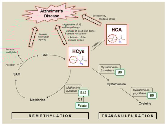 Transsulfuration and re-methylation are major metabolic pathways for HCys (Figure 1), being dependent on an adequate supply of B-vitamins, particularly B6, B12 and folate []. As illustrated, the relevant B-vitamins play key roles in intrinsically decreasing HCys levels and therefore correlate negatively with HCys. Vitamin B12 and folate are crucial in providing methyl groups in the context of the re-methylation cycle, whereas the transsulfuration pathway depends on vitamin B6 as an essential enzymatic cofactor. Disturbed HCys metabolism (Figure 1) is likely to be linked to AD pathology by direct and indirect neurotoxic pathways []. Neurotoxicity is caused by excitotoxicity via N-methyl-D-aspartate receptor (NMDA) activation and by increased levels of reactive oxygen species promoting oxidative stress. Furthermore, excess HCys and subsequently a lack of methionine and S-Adenosyl-L-methionine (SAM), as well as elevated S-Adenosyl-L-homocysteine (SAH), are associated with a reduced methylation capacity and the inhibition of methylation reactions, which is suggested to exacerbate amyloid and tau pathologies in AD. Moreover, HCys results in an activated immune system, damages cerebral vessels and disrupts the blood-brain-barrier [,]. Both homocysteine and its oxidative metabolite homocysteic acid (HCA) are considered neurotoxic [,], but HCA is suggested to be the more potent species [,,] and might contribute to dementia through oxidative stress and excitotoxicity by NMDA activation. Both mechanisms have been considered relevant for AD pathology [,].