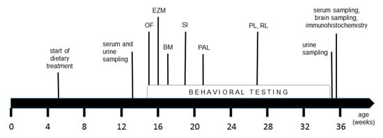 As illustrated in Figure 2, serum and 24-h urine of the mice were sampled after 8 and 30 weeks on experimental diets, resp. 13 and 35 weeks of age. The biological matrices were stored at −80 °C for subsequent analysis of HCys and HCA. At the end of the study, we euthanized all animals at the age of 35 weeks in order to harvest the brains. Brains were removed and post-fixed in 4% paraformaldehyde, followed by a stepwise dehydration, and embedding in paraffin. Ten µm thick sections were cut and mounted on glass slides for subsequent immunohistochemical analysis.