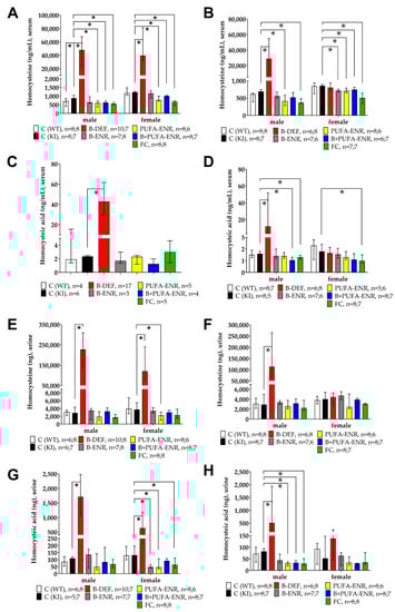 - Ernest, S.; Hosack, A.; O’Brien, W.E.; Rosenblatt, D.S.; Nadeau, J.H. Homocysteine levels in A/J and C57BL/6J mice: Genetic, diet, gender, and parental effects. Physiol. Genom. 2005, 21, 404–410. [Google Scholar] [CrossRef][Green Version]