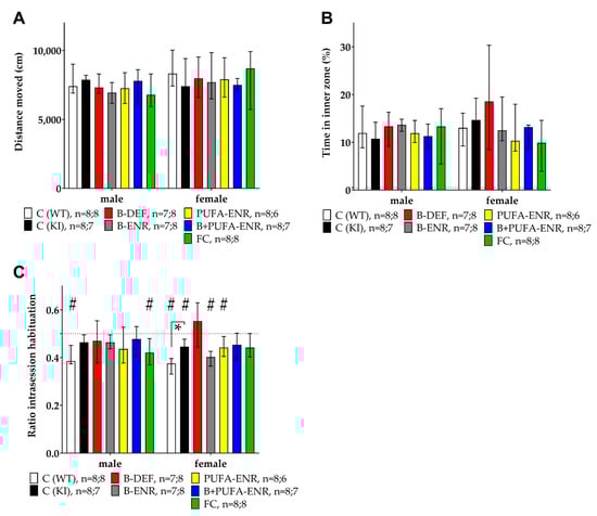 A ratio lower than 0.5 indicates habituation; a ratio of 0.5 means no change in activity, i.e., that no habituation occurred as in the case of groups 2–6 in males and groups 3 and 5–6 in females. Females fed with a vitamin B deficient chow displayed the least tendency to habituate; however, effects of experimental diets did not reach statistical significance in comparison to the KI control group. Female AppNL-G-F control mice displayed a significantly lower level of habituation compared to the C57BL/6J WT control (p = 0.009), indicating an impact of the genotype (Figure 4C).