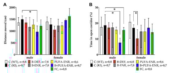 We tested anxiety behavior of each mouse for a session duration of 5 min. C57BL/6J WT and AppNL-G-F KI control mice moved equal distances in the maze; only male AppNL-G-F mice fed with a vitamin B and PUFA enriched diet moved less than AppNL-G-F controls (p = 0.003) and thus displayed lower locomotion activity (Figure 5A). The time spent in the open corridors of the maze was an index for open space-induced anxiety in mice (Figure 5B). No genotype effect was observed between C57BL/6J and AppNL-G-F mice, whereas different dietary interventions showed a reduction of cumulative time in open corridors. Particularly, male mice fed with the combination of PUFA and vitamin B enriched chow as well as with FC-like, spent significantly less time in the open corridors (B+PUFA-ENR p < 0.001; FC p = 0.021) and thus displayed increased anxiety. In females, a reduced time in the open corridors was observed in the vitamin B deficient group (p = 0.040) compared to KI control mice.