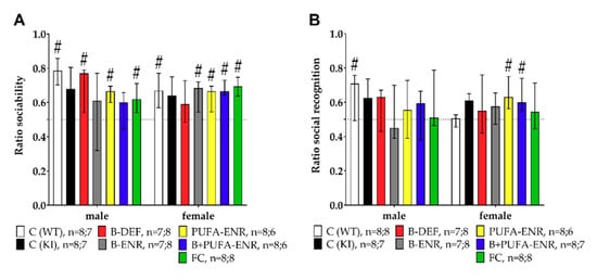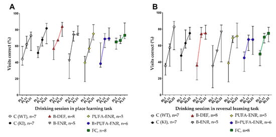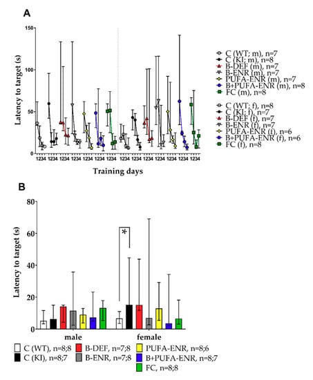 We also investigated other experimental diets besides the vitamin B deficient chow discussed above. Group 4 received a vitamin B enriched diet containing a particular high content of folate, B6 and B12 compared to both the control diet and the FC-like diet. The goal of this diet was to investigate whether an additional increase, specifically of B-vitamins, in comparison to the FC-like diet could provide further benefits in the outcome of the study. Therefore, the difference in B-vitamin contents should simulate a potentially different effectiveness between FC (Souvenaid®) and existing higher dosed vitamin B preparations as human treatment options. In accordance with a recent international consensus statement [], PUFAs (DHA + EPA) have been suggested to be beneficial for cognitive functioning in general and might be additionally linked to AD pathology [,]. Because single nutrient intervention studies often failed to show beneficial effects on cognitive function, it has been suggested that it might be important to investigate combinatory approaches []. For this purpose, we combined the high content vitamin B enrichment with the supplementation of PUFAs (group 6). Finally, group 7 received the FC-like diet, a complex mixture of ingredients (Table A1), which we implemented due to positive previous findings (e.g., [,]).