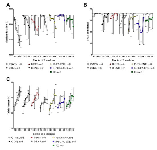The touchscreen PAL was used to assess potential cognitive impairment of the male mice (about five to eight months of age). Both the session duration and the number of trials completed per session, as well as the percentage of correct trials per session were analyzed (Figure 8). The resulting learning curves revealed no statistically significant difference in these parameters between C57BL/6J WT mice and AppNL-G-F KI mice in the final phase of the test (block 6). Hyperhomocysteinemic AppNL-G-F mice did not perform worse than AppNL-G-F control mice. Other experimental diets also had no benefit on the cognitive abilities of AppNL-G-F mice at this age. The C57BL/6J WT group showed a smaller variability in the touchscreen chambers in comparison to the AppNL-G-F KI groups. This effect was particularly observed in the parameter trials completed (Figure 8B). Vitamin B deficient animals showed a tendency to perform better at the beginning of the test (trials completed, block 1) and thus did not display a learning curve like that of AppNL-G-F control mice. However, no effects reached statistical significance in block 6. Animals fed with a vitamin B and PUFA combination diet did not reach the maximum number of trials per session. Therefore, the session duration scarcely also decreased over time in this group. The proportion of correct and incorrect trials was not affected.