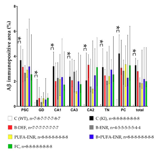 Figure 10 illustrates examples of brain sections of a C57BL/6J WT mouse and an AppNL-G-F KI mouse. Aβ plaques, indicated by characteristic brown staining, occurred abundantly and diffusely in the brain sections of the KI animals (Figure 10B), whereas WT mice did not show any signs of Aβ deposition at all (Figure 10A). The differences in the Aβ burden between the C57BL/6J and AppNL-G-F genotype, as well as a potential impact of the experimental diets, were further analyzed using ImageJ software. Semi-quantification of the Aβ burden confirmed a significant difference between WT and KI control groups (Figure 11) in all ROI (p < 0.001; p = 0.002; p < 0.001; p < 0.001; p < 0.001; p < 0.001; p < 0.001; p < 0.001).