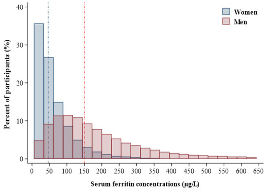 Frequency distribution of serum ferritin concentrations in men (red area) and women (blue area). Vertical lines represent the medians of serum ferritin levels in men (red line; serum ferritin = 150 µg/L) and women (blue line; serum ferritin = 46.6 µg/L), and the box is truncated at the 1st (6 µg/L) and 99th (642.8 µg/L) percentiles.