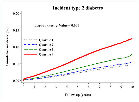 The unadjusted incidence rate of diabetes rose across increasing quartiles of baseline SF; the incidence in the upper quartile (9.9%) was approximately 2.5 times greater than that in the lowest quartile (3.8%). The Kaplan–Meier curve showed that participants in the top quartile of SF (≥258.1 in men; ≥82.8 in women) had the highest cumulative incidence rate of type 2 diabetes, with an apparent dose-response (log-rank p < 0.001) (Figure 2).