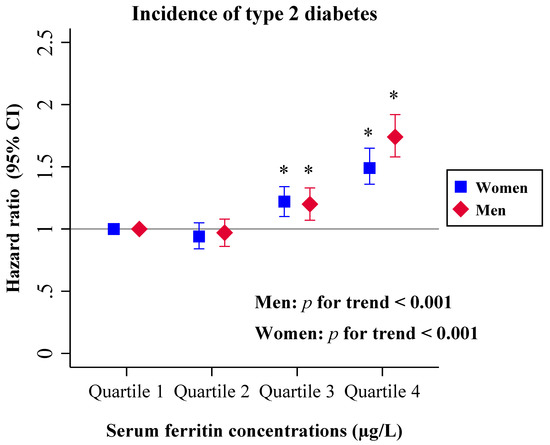 Cox proportional-hazards regression models were used to calculate HRs (95% CIs) for incidence of type 2 diabetes, according to the quartiles of serum ferritin (µg/L), separately for men (red diamond) and women (blue square). Serum ferritin quartiles (Q): Q1 (≤90.0 in men; ≤25.0 in women) (reference), Q2 (90.1–154.6 in men; 25.1–46.0 in women), Q3 (154.7–258.0 in men; 46.1–82.7 in women), and Q4 (≥258.1 in men; ≥82.8 in women). The Cox proportional-hazards regression models were adjusted for age (years), smoking (smoker, non-smoker or ex-smoker), risk levels for alcoholism (0, 1, or 2 and 3), dyslipidemia (yes or no), hypertension (yes or no) and body mass index (kg/m2). The horizontal line represents hazard ratio = 1. * p < 0.05 versus 1st quartile of serum ferritin concentration. HR, hazard ratio; CI, confidence interval.