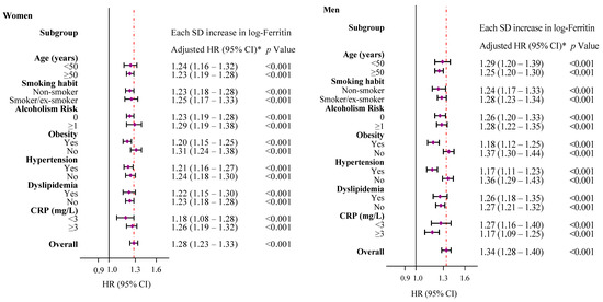 Since men had significantly higher SF concentrations than women, we stratified the results by sex. We, therefore, show stratified analyses in pre-specified subgroups according to age (<50 or ≥50 years), smoking status (non-smoker or smoker/ex-smoker), alcoholism risk score (0 or ≥1), obesity (yes, ≥30 kg/m2, or no, <30 kg/m2), hypertension (yes or no), dyslipidemia (yes or no) and CRP (<3 (median) or ≥3 mg/L) for each sex. In this case, the corresponding multivariable-adjusted HR (95% CI) for incident diabetes associated with a 1 SD increase in log-transformed SF was provided.