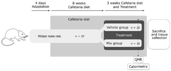 Experimental design of the animal study. A total of 32 Wistar male rats were adapted to the housing conditions for four days. Animals were fed a cafeteria diet ad libitum for 11 weeks. The body weight and food intake of the animals were recorded once each week. After eight weeks of cafeteria diet, animals were randomly distributed in two groups (n = 16) and orally supplemented with a mix (mix group) of natural ingredients, composed of 25 mg grape seed proanthocyanidin extract (GSPE)/kg body weight, 100 mg conjugated linoleic acid (CLA)/kg body weight, 100 mg anthocyanins/kg body weight, and 55 mg of chicken feet hydrolysate (CFH)/kg body weight, diluted in a sugary solution (sucrose/water; 1:1 w/v) or with the vehicle (VH group), composed of 400 mg/kg of maltodextrin diluted in the same sugary solution. After three weeks of treatment, animals were sacrificed and tissues collected. Four or five days before sacrifice, indirect calorimetry was performed on eight random animals per group for 24 h. One day prior to sacrifice, the fat mass and lean mass of the other eight animals per group were analyzed by quantitative magnetic resonance (QMR).