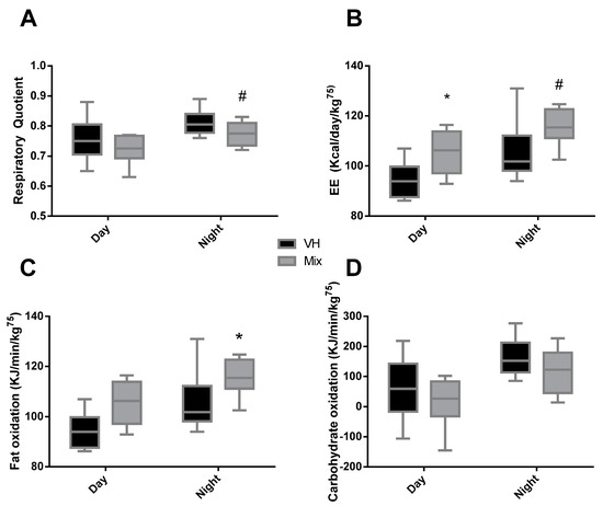 Respiratory quotient (RQ) (A), energy expenditure (EE) (B), fat oxidation (C), and carbohydrate oxidation (D) during day and night, measured during 24 h four or five days before sacrifice, of Wistar rats fed a CAF diet for 11 weeks and supplemented with the vehicle or a mix of ingredients containing GSPE, anthocyanins from bilberry and blackcurrant, CLA, and CFH during the last three weeks. Box plots represent the median and Tukey whiskers (n = 8), and both groups were compared with Student’s t-test (* p < 0.05, # p < 0.1).
