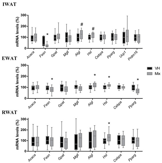 In EWAT, mix treatment significantly reduced the gene expression of Fasn and Pparγ, while it increased the expression of Atgl and Hsl genes compared to the VH. In IWAT, the mix treatment highly reduced Fasn gene expression, while it showed a tendency to upregulate the gene expression of Atgl and Hsl (p = 0.078 and p = 0.055, respectively). Additionally, in the IWAT, we analyzed the gene expression of Ucp1 and Prdm16, but their expression was unaffected by the treatment. RWAT showed a significant increase in Hsl gene expression in the mix group compared to the VH group, and no changes were observed in any of the other genes analyzed (Figure 3).