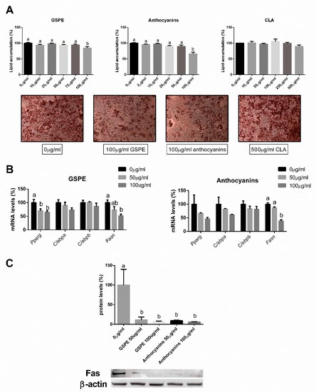 Results showed that 100 µg/mL of GSPE and 100 µg/mL of anthocyanins significantly reduced lipid accumulation in 3T3-L1 cells when compared to the untreated group (Figure 5A). CLA showed no changes in lipid accumulation; therefore, its gene and protein expression profiles were not quantified.