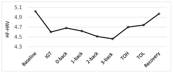 Psychophysiological responses (High-frequency heart rate variability; HF-HRV) during each condition: baseline, Iowa Gambling Tasks (IGT), N-back tasks (0-back, 1-back, 2-back and 3-back), Tower of Hanoi (ToH), Tower of London (ToL) and recovery, before the intervention for all participants.