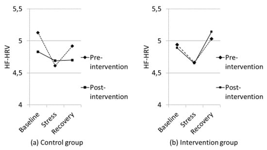 The interaction among time (pre- and post-intervention), experimental stress procedure, and groups was not significant, F (2, 132) = 2.116, p = 0.125, η2 = 0.03. However, for the Intervention group-adjusted Bonferroni demonstrated a significant decrease from baseline to stress (p = 0.009; d = 0.21) and a significant increase from stress to recovery at pre-test (p < 0.001; d = 0.29). A generally identical pattern of results was found post-intervention. From baseline to stress there was a decrease in HF-HRV, but this was not statistically significant according to the adjusted Bonferroni (p = 0.036; d = 0.18) (Adj. Bonferroni p = 0.013). However, the increase from stress to recovery was statistically significant according to the adjusted Bonferroni (p < 0.001; d = 0.38) (see Figure 3). Moreover, adjusted Bonferroni showed that the Control group had a significant decrease in HF-HRV from baseline to stress (p < 0.001; d = 0.35) and a significant increase from stress to recovery (p = 0.005; d = 0.22) pre-intervention. However, the results post-intervention were different for the Control group. There was no significant change from baseline to stress (p = 0.208; d = 0.11) or from stress to recovery (p = 0.90; d = 0.00) (see Figure 3).