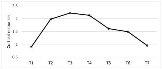 Analyses of cortisol responses revealed a main effect of the time of day, F (6, 414) = 99.97, p < 0.001; η2 = 0.59. Follow-up tests revealed there was a significant increase from the evening prior to the experimental testing sessions (T1) to waking up on the testing day (T2) (p < 0.001; d = -1.64). From waking up (T2) to 15 min after wakeup (T3) there was a peak of cortisol (p = 0.001; d = 0.32). From wake up (T2) to 30 min after waking up (T4) the cortisol response was still higher than at wake up, but this was not significant (p = 0.057; d = 0.20) (T2, T3 and T4 = CAR). Thus, there was a slight, but non-significant, decline from T3 to T4 (p = 0.22; d = 0.13). There was a significant reduction from 30 min after waking up (T4) to 15 min before the start of the experimental stress procedure (T5; p < 0.001; d = 0.81), but not from pre-stress to 15 min post-stress (T6) (p = 0.11; d = 0.21). There was a significant decrease from post-stress (T6) to the evening of the experimental testing day (T7) (p < 0.001; d = 0.81; see Figure 4). No other results were significant.