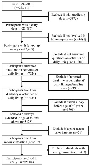 This study was based on the China Health and Nutrition Survey (CHNS). Details about the CHNS has been described elsewhere [21]. In brief, the CHNS is an open cohort study, and participants from twelve geographically diverse areas of China were involved in this study. The CHNS was designed to understand the health and nutrition of the Chinese and how they are affected by social transformation. It was initiated in 1989, and follow-up surveys were conducted in 1991, 1993, 1997, 2000, 2004, 2006, 2009, 2011, and 2015. Data collected in phase 1997 and beyond were used in the present study. The inclusion criteria included answered the ADL survey and aged 60 years and above at the end of the survey (report of ADL disability, loss to follow-up, the phase of 2015, whichever occurred first). The exclusion criteria included absent from dietary survey, report of ADL at baseline survey, report of previously diagnosed cancer at baseline survey, and missing values on covariates. In the end, 5004 participants were included this study (Figure 1). The CHNS was approved by institutional review boards at the University of North Carolina at Chapel Hill and the National Institute of Nutrition and Food Safety, Chinese Center for Disease Control and Prevention. All participants gave written informed consent before they participated in the survey.