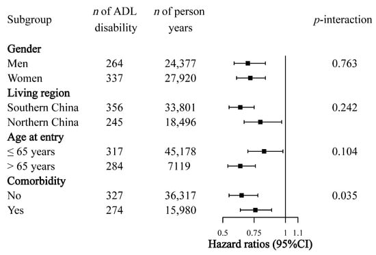 Subgroup analysis of association of continuous dietary diversity score (DDS) with disability in activities of daily living (ADL). Hazard ratios were estimated by Cox proportional regression models. Multivariate models were adjusted for age at entry (continuous), gender (men or women), living region (southern or northern China), residency (urban or rural), income (low, middle, or high), education level (primary school and below or middle school and higher), smoking status (smoker or not), physical activity (≤100 or >100 metabolic equivalent of task-hours/week), body mass index (continuous), and comorbidities (no or yes). Analyses within subgroups were adjusted for all other covariates.