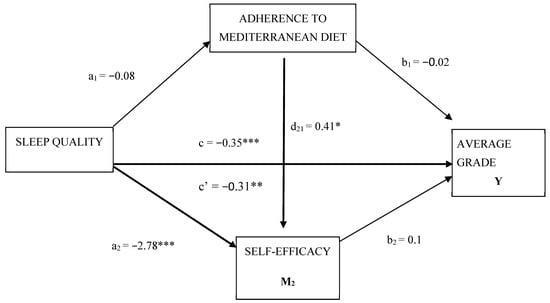 Firstly, it is observed that the direct effect, including adherence to the Mediterranean diet (M1) and self-efficacy (M2), between sleep quality and mean academic score is significant (β = −0.31; p < 0.01) (Table 3). The total effect between both variables is also significant (β = −0.35; p < 0.001). Secondly, there is a significant relationship of sleep quality (X) on self-efficacy (M1) (β = −2.78; p ˂ 0.001). Finally, there is a positive relationship of adherence to the Mediterranean diet (M1) on self-efficacy (M2) (β = 0.41; p ˂ 0.05).