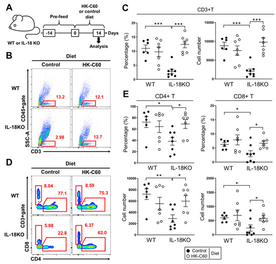 3.1. HK-C60 Diet Restores T Cell Population Which Decreased in SI-LP of Aged IL-18KO Mice