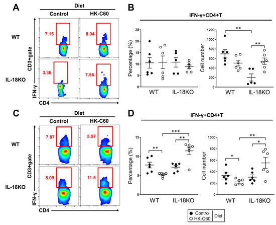 Th1 cell population was increased in small intestine of IL-18KO mice with HK-C60 diet. (A–D) Effector CD4+ T cell population in SI-LP and PPs isolated cells were analyzed by flow cytometry. The isolated cells were re-stimulated with PMA/Ionomycin combined with GolgiStopTM at 37 °C for 5 h. The representative image of IFN-γ+CD4+ T (Th1) cell population in CD45+CD3+ gate in SI-LP (A) and PPs (C). The percentage of Th1 cells in CD45+CD3+CD4+ gate in SI-LP (B, left) and PPs (D, left). The number of Th1 cells in CD45+CD3+gate (per 104) in SI-LP (B, right) and PPs (D, right). The data were shown as the representative or mean ± SEM of six samples in three independent experiments. Each dot indicates the data from one sample. A Mann–Whitney U test was used to analyze data for significant differences. Values of * p < 0.05, ** p < 0.01, and *** p < 0.001 were regarded as significant.