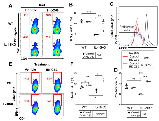 Taken together, HK-C60 promotes CD4+ T cells activity such as IFN-γ production and cell proliferation, which are induced by TCR-dependent stimulation, in PP of IL-18KO mice.
