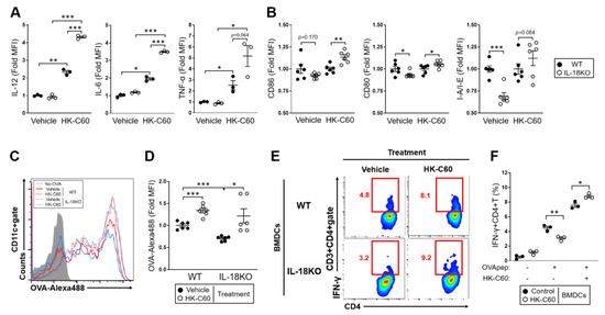 To investigate the DCs function related with antigen presentation into CD4+ T cells activation, we performed both antigen uptake assay and antigen presentation assay. The BMDCs showed an abundant uptake of OVA as an exogenous antigen, and the activity in WT cells was significantly higher than IL-18-deficient BMDCs in the vehicle treatment. The OVA uptaking was enhanced in both WT and IL-18-deficient BMDCs in HK-C60 stimulation compared with vehicle control, while the level in IL-18-deficient cells was reached to almost similar as that of WT cells (Figure 4C,D).