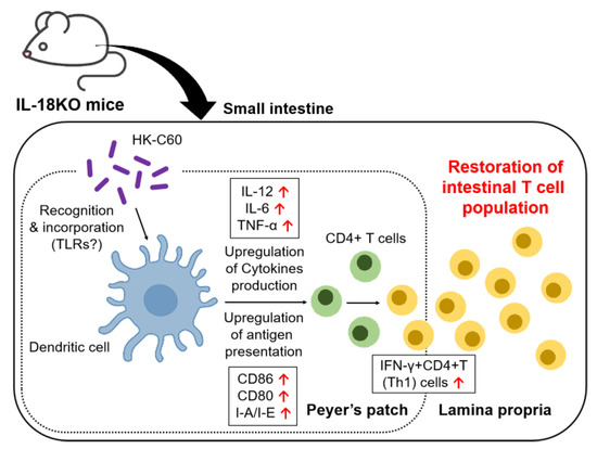 The following are available online at https://www.mdpi.com/2072-6643/12/11/3287/s1, Table S1. The Ab staining combination in flow cytometry analysis; Figure S1: The decreasing of specific population in CD45+ cells in SI-LP of IL-18KO mice, Figure S2: Age-associate decreasing of CD3+ T cells in SI-LP, Figure S3: HK-C60 induces cytokine production and cellular activation in BMDCs, Figure S4: The characterization of T cells in non-intestinal environment and PP, Figure S5: The thymic development of T cells, Figure S6: The number of PP isolated cells, Figure S7: The basal status of primary PP DCs.