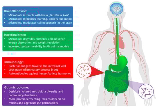 The gut microbiota and its interaction with the host are currently drawing increased attention from researchers and clinicians with respect to multiple diseases, both somatic and psychiatric [,]. There are now over 2000 microbial species known to inhabit the human gut [], and each individual has a “personal” combination of approximately 500 species with a total weight of over 1 kg []. The major influencing factor that affect this combination of species is nutrition, while genetics, current illnesses, medication, stress, exercise and past experiences (such as mode of birth, having been breastfed, past illnesses and lifetime use of antibiotics) also appear to contribute [,]. Host–microbe interactions are equally manifold; as human evolution took place in a world full of microbes, symbiotic partnerships provided evolutionary advantages to both the microbes and host []. Gut microbes perform many functions, e.g., in the digestive system, gut microbes break down food with enzymes not expressed by humans, allowing for a greater diversity of nutrients to be used and more derivatives to be extracted, including fatty acids or essential vitamins []. Thus, the gut microbiota can increase or decrease the amount of energy extracted from the same amount of food, which is important for weight regulation. However, host–microbe interactions also include continuous cross-talk with intestinal cells, which influences gut-wall permeability, inflammatory and immunological processes and the secretion of gastric and bacteria-derived hormones []. Increasingly, complex direct and indirect interactions between the microbiota, gut and brain, termed the “microbiota-gut–brain axis”, have become increasingly apparent, and microbiota causally influence complex behaviors, such as learning, stress, depression and anxiety [,], all of which also play important roles in AN []. The potential mechanisms involve direct vagal nerve signaling, migration of immune cells into the brain, and changes in the secretion of cytokines, antibodies, hormones and nutritional components [,]. AN can probably be regarded as a helpful model for studying and learning about host-microbiota interactions, since AN is characterized by different factors, such as altered nutrition, weight, hormonal levels, gastrointestinal function and behaviors and the possibility of modifying these factors within a relatively short amount of time during therapy. Furthermore, re-alimentation is a key factor in AN therapy, but controlled studies on how to refeed, with which nutrients and at what rate, remain scarce []. Given the important role of nutrition in the gut microbiota, the specific effects of re-alimentation remain unknown; failing to take into account interactions with gut microbes might actually cause iatrogenic harm []. On the other hand, nutritional interventions and pre- or probiotics (food enabling the growth of beneficial bacteria or beneficial bacteria themselves) could positively influence the gut microbiota and are currently becoming interesting research targets to complement current AN treatment. In this review, we first describe the most important general findings with regard to the mechanisms of host-microbiota interactions. Then, we describe the potential role of these interactions in the pathophysiology and clinical course of patients with AN.