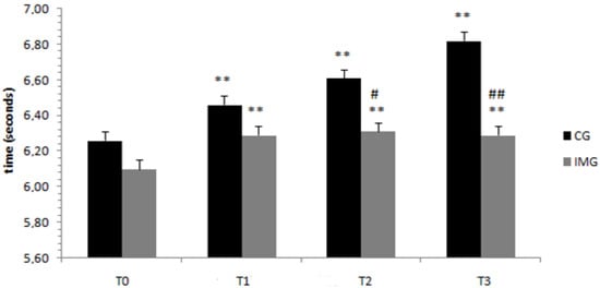 Regarding the MAT-Agility test, the ANOVA results showed a significant interaction of Ramadan period (before/at the beginning/in the middle/at the end) × motor imagery (with or without) (F (3.108) = 16.69; p < 0.001; ηp2 = 0.317). Results revealed that in the motor imagery condition, the means of the scores of the MAT-Agility test were greater at the beginning (T1), in the middle (T2), and at the end of Ramadan (T3) compared to before Ramadan (T0) (p < 0.001). A similar trend could be observed for the training condition without motor imagery at p < 0.001 (Figure 3). With regard to the difference between the groups in the same periods, the means of the times of the MAT-Agility test were higher for the control group than for the imagery training group in the middle (T2) (p < 0.042) and at the end of Ramadan (T3) (p < 0.002).
