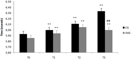 Regarding the ZIG-ZAG speed test, the ANOVA results showed a significant interaction of Ramadan period (before/at the beginning/in the middle/at the end) × motor imagery (with or without) (F (3.108) = 51.69; p < 0.001; ηp2 = 0.589). In the motor imagery condition, the ZIG-ZAG speed test time averages were greater than at the beginning (T1), in the middle (T2), and at the end of Ramadan (T3) with respect to before Ramadan (T0) at p < 0.003, p < 0.001, and p < 0.001, respectively. A similar trend could be observed for the training condition without motor imagery at p < 0.003, p < 0.001, and p < 0.001, respectively. With regard to the difference between the groups in the same periods, the ZIG-ZAG speed test time averages were higher for the control group than for the imagery training group at the end of Ramadan (T3) (p < 0.002), as shown in Figure 4.