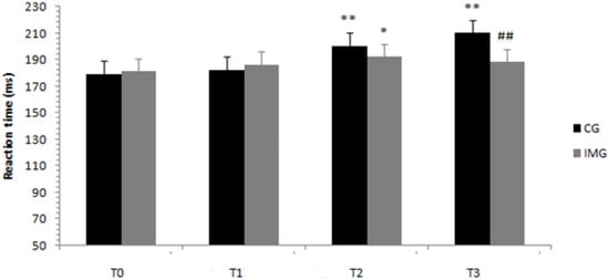 Regarding the reaction time, the ANOVA results showed a significant interaction of Ramadan period (before/at the beginning/in the middle/at the end) × motor imagery (with or without) (F (3.108) = 8.1; p < 0.001; ηp2 = 0.184). Results revealed that in the motor imagery condition, the mean reaction times were greater in the middle of Ramadan (T2) compared to before Ramadan (T0) (p < 0.014). For the training condition without motor imagery, the mean reaction times were greater in the middle of Ramadan (T2) and at the end of Ramadan (T3) compared to before Ramadan at p < 0.001 and p < 0.001, respectively. With regard to the difference between the groups in the same periods, the means of the reaction times were higher for the control group than for the imagery training group only at the end of Ramadan (T3) at p < 0.001, as shown in Figure 5.