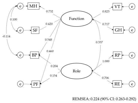 The SF 36 consists of eight subscales. Descriptive statistics of the eight subscales are presented in Supplementary Table S2. For these subscales, factor analysis was carried out through the major factor method with varimax rotation. Factor scores were used as summary scores of the factors for the following analysis. The results are shown in Supplementary Table S3. The subscales consisted of two factors. These factors were named the function and the role. Based on this result, structural equation modeling (SEM) was carried out. The results are shown in Figure 1. Body pain (BP) and physical functioning (PF) correlated with both latent variables.