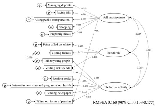 Structure of the ADL. Items of the TIMG Index involved 3 factors. Visiting sick friends and filling out the pension. Pension were correlated with two latent variables. Correlations between latent variables were statistically significant. However, the correlations were very weak. ADL: activity of daily living, TMIG index: The Tokyo Metropolitan Institute of Gerontology index of competence. e: Error variable. REMSEA: root-mean-square error of approximation