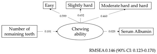 Correlations among number of remaining teeth, chewing ability, and serum level of albumin. REMSEA: root-mean-square error of approximation