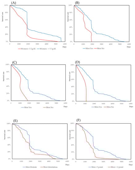 Survival curves of the significant factors for mortality. (A) Serum levels of albumin for women. (B) Ability to chew Konnyaku-jelly of men. (C) Ability to chew Tubular roll of boiled fish paste of men. (D) Ability to chew Steamed rice of men. (E) Edentulous. (F)Intellectual activity of men.
