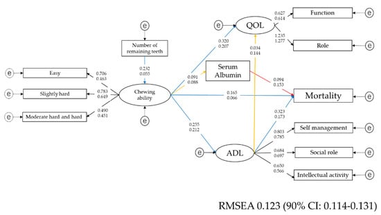 Finally, by using all health-related factors investigated in this study, multiple group structural equation modeling was conducted for men and women. The results are presented in Figure 5. Black lines indicated statistical significance for both men and women, blue lines indicate significance only in men, red lines indicate significance only in women, and orange lines indicated no significance for either men or women. Self-assessed chewing ability was not associated with serum albumin. ADLs were not associated with QOL.