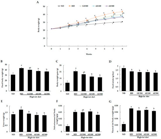 Effect of Abeliophyllum distichum extract (AE) on body weight and liver and fat weight in the experimental mice. Mice were fed a high-fat diet and orally administered a Garcinia extract (300 mg/kg b.w) or an A. distichum leaf extract at a low (100 mg/kg b.w) or at a high dose (300 mg/kg b.w) for 8 weeks. (A) Body weight during the experimental period, (B) final body weight, (C) body weight gain, (D) feed intake, (E) liver weight, (F) subcutaneous fat weight, and (G) visceral fat weight. ND, normal diet, HD, high-fat diet, GE300, high-fat diet + Garcinia 300 mg/kg b.w, AE100, high-fat diet + 100 mg/kg b.w, AE300, high-fat diet + 300 mg/kg b.w. Values are expressed as mean ± SEM, n = 10. The varying superscript letters indicate a statistically significant difference among the groups by Duncan’s test of ANOVA, p < 0.05.