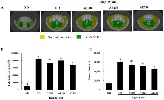 Effect of AE on abdominal fat volume in the experimental mice. Mice were fed a high-fat diet and orally administered a GE (300 mg/kg b.w) or an AE (leaf extract) at low dose (100 mg/kg b.w) or high dose (300 mg/kg b.w) for 8 weeks. (A) Micro-CT image of the abdomen region, (B) subcutaneous fat volume, and (C) visceral fat volume. ND, normal diet, HD, high-fat diet, GE300, high-fat diet + Garcinia 300 mg/kg b.w, AE100, high-fat diet + 100 mg/kg b.w, AE300, high-fat diet + 300 mg/kg b.w. Values are expressed as mean ± SEM, n = 5. The varying superscript letters indicate a statistically significant difference among the groups by Duncan’s test of ANOVA, p < 0.05.