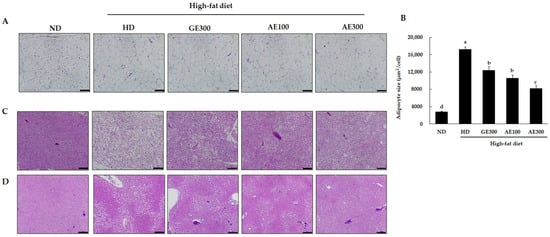 The images obtained from the micro-CT analysis revealed that treatment with a high dose of AE reduced the subcutaneous and visceral fat volumes compared to administration of HD (Figure 2A). SAT and VAT volumes were significantly decreased in the AE300 group compared to the HD group (Figure 2B,C). Furthermore, H&E staining of epididymal WAT showed that the size of adipocytes was significantly increased in the HD group compared to the ND one, as shown in Figure 3A,B. However, supplementation with GE, AE100, and AE300 significantly reduced adipocyte size. H&E staining of brown adipose tissue (Figure 3C) and liver (Figure 3D) revealed that HD-induced ectopic lipid accumulation was significantly reversed by treatment with GE300, AE100, and AE300. Interestingly, this reversal effect was more prominent in the AE300 group.